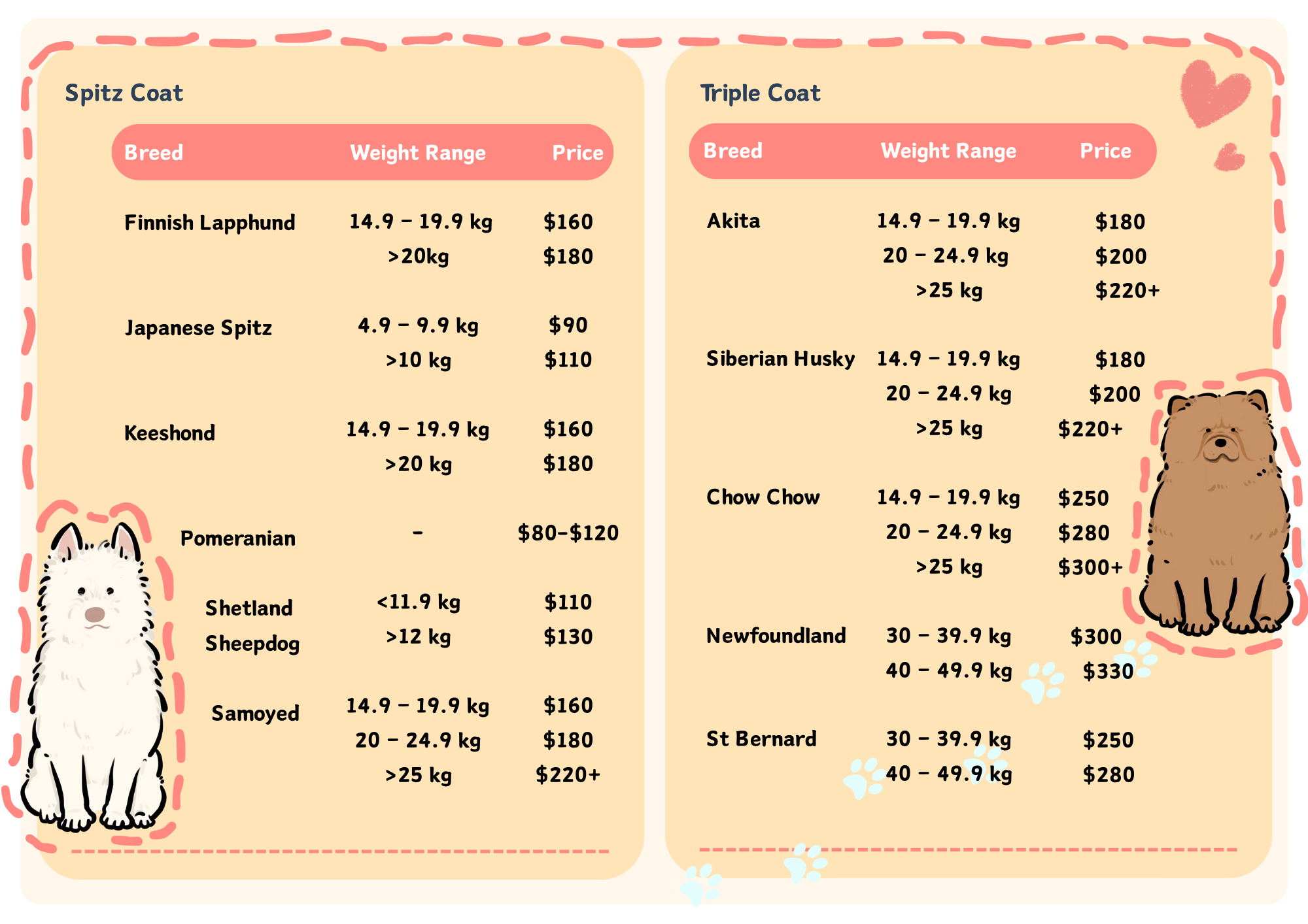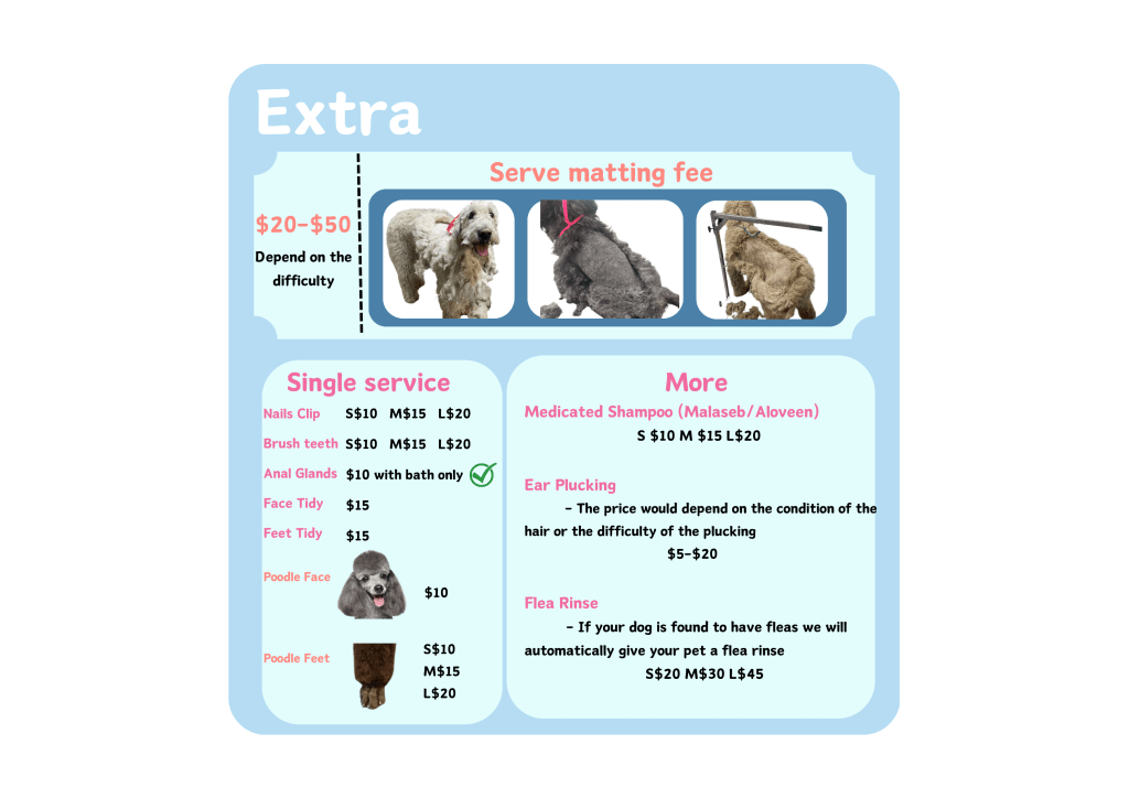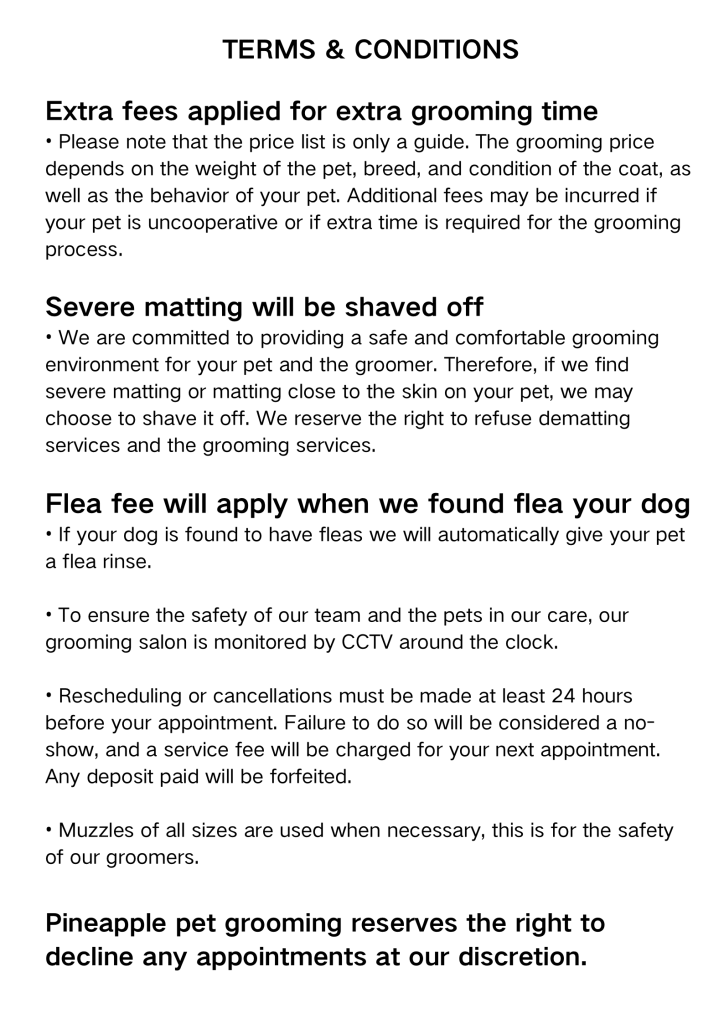 Due to safety and handling considerations, we are currently unable to provide grooming services for dogs over 30 kg.