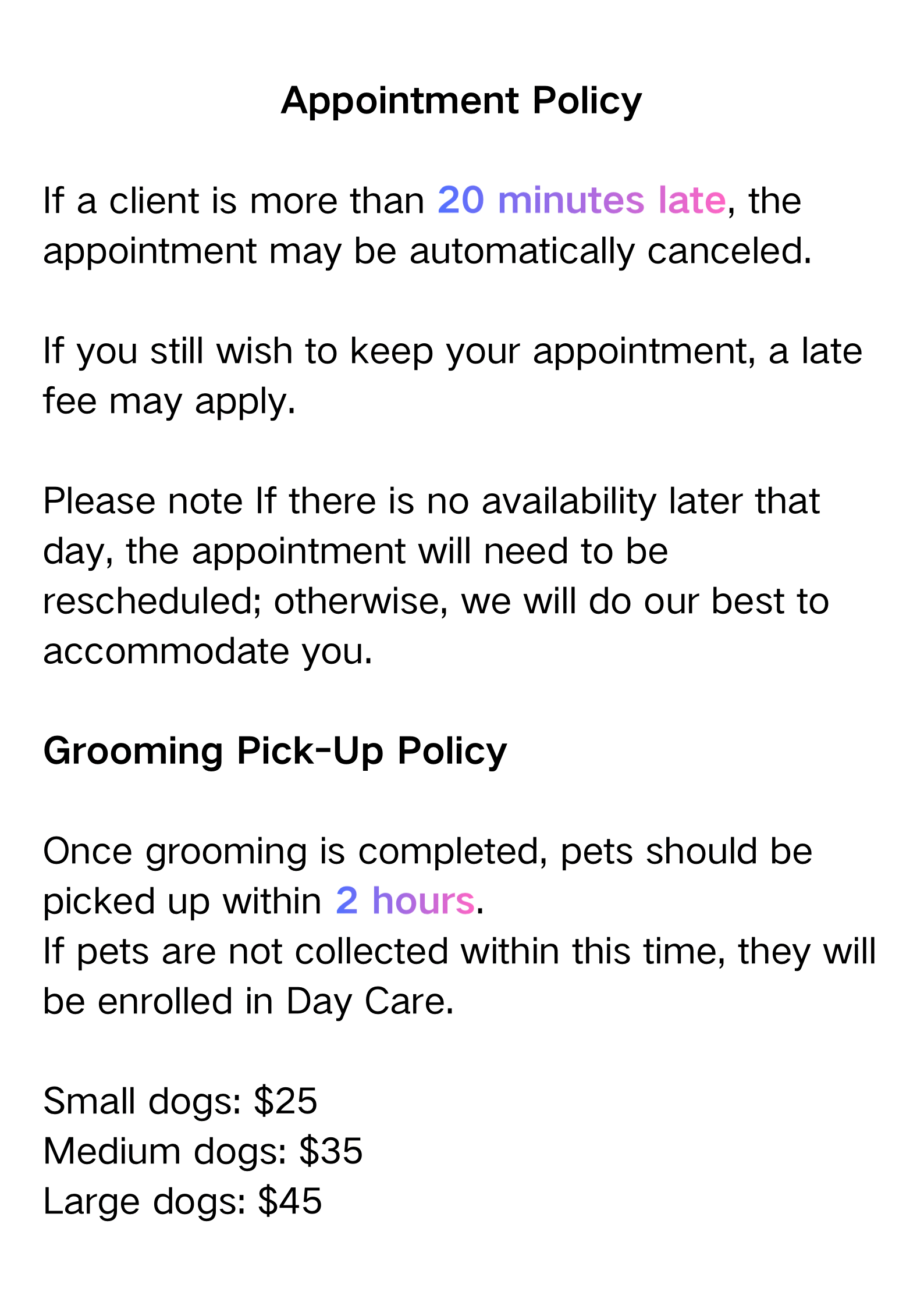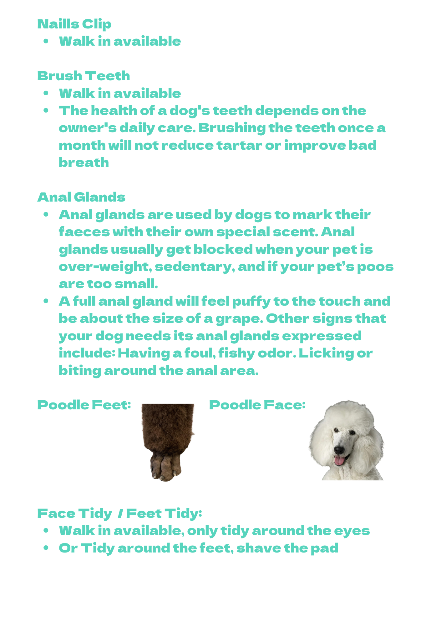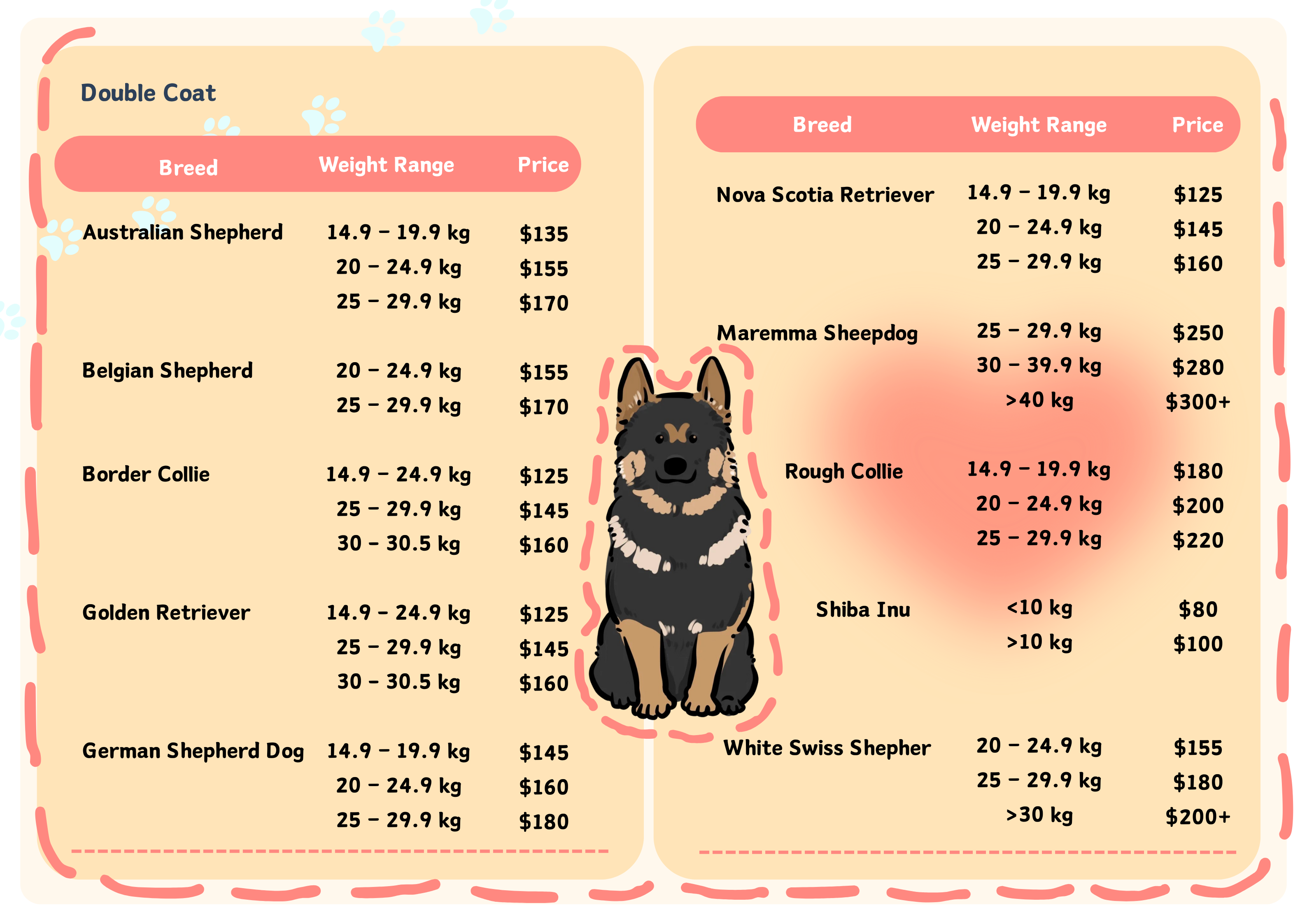 Due to safety and handling considerations, we are currently unable to provide grooming services for dogs over 30 kg.